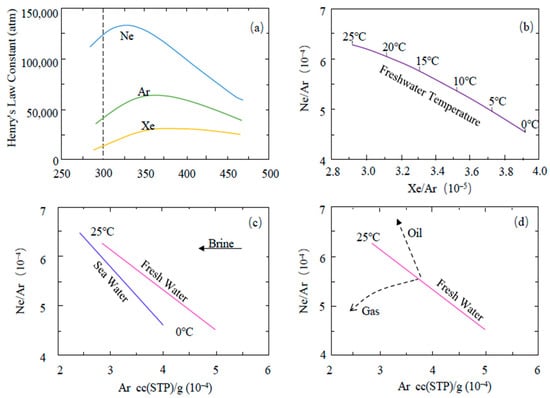 (a) The relationship between Henry’s law constants of Ne, Ar, and Xe and temperature, (b) the trend of atmospheric Ne/Ar and Xe/Ar ratios dissolved in freshwater with water temperature, and (c) the relationship of the concentrations of Ne and Ar dissolved in seawater and freshwater with temperature and salinity. The increase in salinity will not considerably change the relative solubility of Ne and Ar but will reduce the concentration of noble gases from the atmosphere in the solution. (d) The interaction between groundwater and another phase will cause the noble gases to be redistributed between the two phases; the figure predicts the impact of oil–water and gas–water interaction on the concentrations of dissolved atmospheric Ne/Ar ratio and Ar concentration [,,] (Henry’s law constant; temperature).