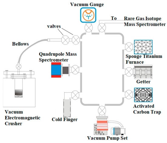 The system to extract and purify noble gases from solid samples (vacuum gauge; titanium sponge furnace; quadrupole mass spectrometer; Zr–Al pump; vacuum electromagnetic breaker; cold finger; activated carbon trap; vacuum pump group).