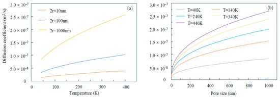 where ζmb is the correction factor for porous media geometry; δ represents the ratio of the gas molecule diameter, d, and the local average pore diameter, 2r; Df is the fractal dimension of the pore wall; M represents molecular mass; R represents the gas constant; and T represents temperature. Based on this relationship, researchers simulated the relationship between the diffusion coefficient and temperature, as shown in Figure 4a. Temperature had a significant impact on the helium diffusion in large pores (1000 nm). Under the same temperature, the diffusion coefficient of large pores (1000 nm) was one order of magnitude greater than that of small pores (10 nm). For small pores, the temperature impact on the diffusion coefficient was not obvious. The pore size of the space where helium occurs was also important in helium diffusion, as shown in Figure 4b. The diffusion coefficient dramatically increased with pore size in the range of small pores and stably increased in the range of large pores. Additionally, under the same pore size, the effect of temperature on the diffusion coefficient was more significant in the low-temperature range, and its effect decreased with increasing temperature. Furthermore, researchers found that the diffusion coefficient of the highest temperature was about five times greater than that of the lowest temperature [].