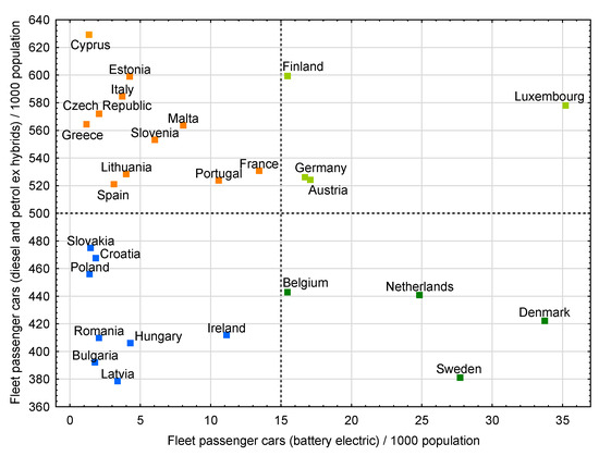 Despite the fact that the percentage of cars using alternative energy sources increases year by year, the means of transport based on fossil sources (diesel and petrol) still play an important role in road transport. The figure (Figure 1) presents the mutual dependence of the fleet of electric passenger cars (BEV) per 1000 inhabitants and the fleet of passenger cars using traditional energy sources per 1000 inhabitants in individual European Union countries in 2023. Based on the analysis of the data presented in the figure, four groups of countries marked with different colors can be distinguished. It can be seen that, in all countries, cars that use fossil fuels as an energy source are still the dominant means of passenger transport. Among them, there are countries where the indicator of cars based on alternative energy sources per 1000 inhabitants is small, below 15, but there are also countries characterized by even twice as high values (Denmark and Luxembourg).