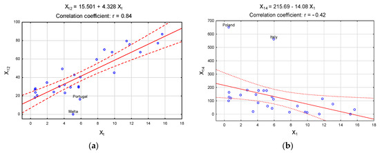 (a) Correlation between X1 and X12; (b) correlation between X1 and X14 (the solid line indicates the regression line, the dashed line indicates the 0.95 confidence interval). Source: own study using the Statistica 13 program.