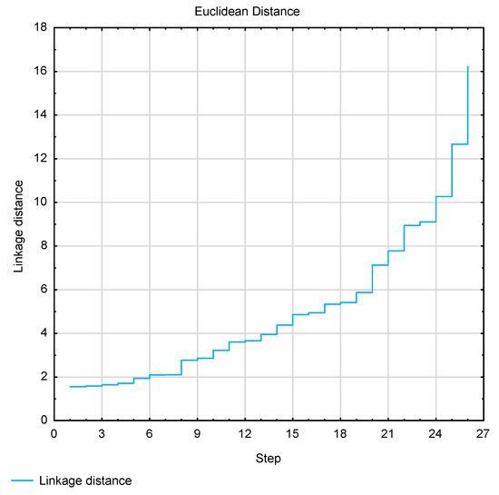 The agglomeration cluster analysis method proposed by Ward [72] uses the variance analysis approach to estimate the distance between clusters. In this method, the sum of squared deviations of any two clusters that can be formed at each stage is minimized. It is considered a very effective method, although it tends to create clusters of small size; it also provides full control over the resulting number of groups and presents the most natural clusters of grouped elements.