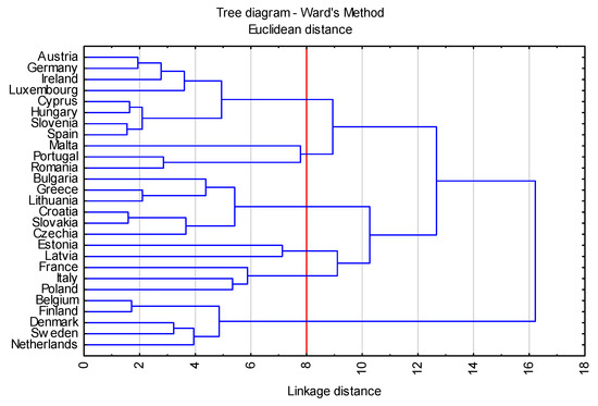 Firstly, it should be pointed out that all the features adopted for the study are characterized by high variability, and in each case, the coefficient of variation is higher than 10%, which is considered the limit of homogeneity of the community. The greatest variability occurs for the variable X10 and amounts to 336%, and the most homogeneous in the countries studied is the indicator X13, which amounts to only 33%, which means that the countries studied are at a similar level in terms of this feature.