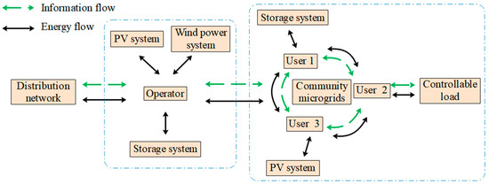 In this study, we focus on a community microgrid operator equipped with wind, photovoltaic, and storage units—which represent the predominant share of current development. Figure 1 illustrates the overall system architecture. The operators act as intermediaries, connecting users of the community microgrid with the power grid. Among them, the aggregators have their own independent new energy power generation equipment and energy storage equipment. The community microgrid also has photovoltaic systems and energy storage systems. The operator achieves the purpose of making profits by cluster regulating the controllable loads in the community microgrid. By coordinating operations in this way, microgrid users benefit from more effective scheduling than they would achieve on their own. Managing building clusters becomes possible for an operator upon signing a load scheduling agreement; this involves accounting for the load curve, upper-level grid time-based pricing, and consumer satisfaction with their electricity use. Therefore, once the community microgrid users have an agreement with the operator, the operator can manage the dispatchable flexible loads of the building clusters at suitable times in accordance with the load curve, the higher-level grid’s time-of-use rates, and the users’ comfort in electricity usage. This approach ultimately enables the operator to gain economic benefits.