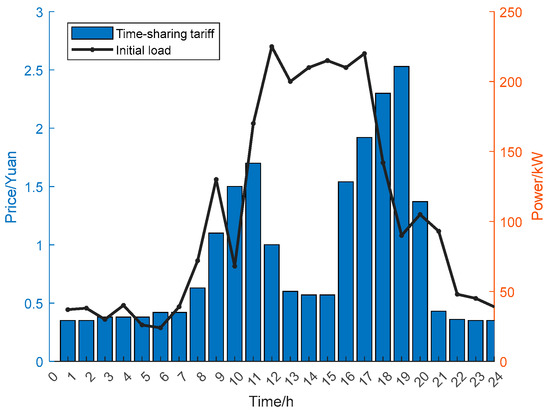 In this paper, a community microgrid in a pilot area (Southern China) serves as a computational case study, with its topology illustrated in Figure 1. A correlation function is established between the operator’s cost of the community microgrid and the load users’ electricity satisfaction. Energy storage equipment for the operator has a rated capacity of 350 kW·h, the rated capacity of the user-side energy storage is set to be 25 kW·h, and the initial state of charge is set to 0.3. The operation and maintenance parameters of new energy and energy storage are shown in Table 1. The power interaction price between the community microgrid operator and the higher-level grid is in the form of a time-sharing tariff, as shown in Figure 2 [21]. The operator utilizes the price difference between the higher-level grid and the microgrid users to make profit through the operation strategy of cluster regulation.