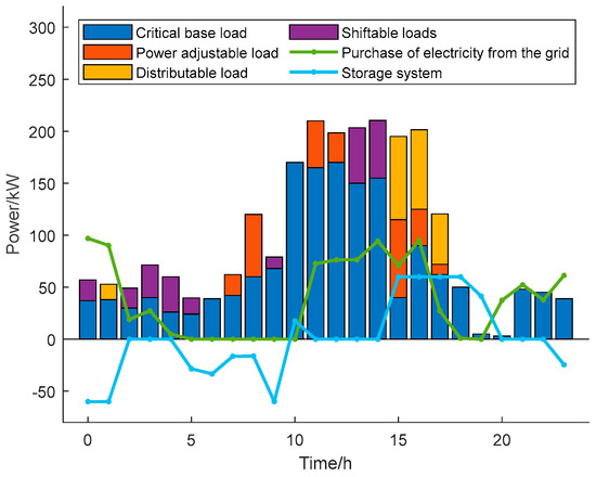 The load profile of the microgrid operator after dispatching in Scenario 1 is shown in the following picture, and the operator’s energy storage system and power purchases from the higher grid after optimization are shown in Figure 3.