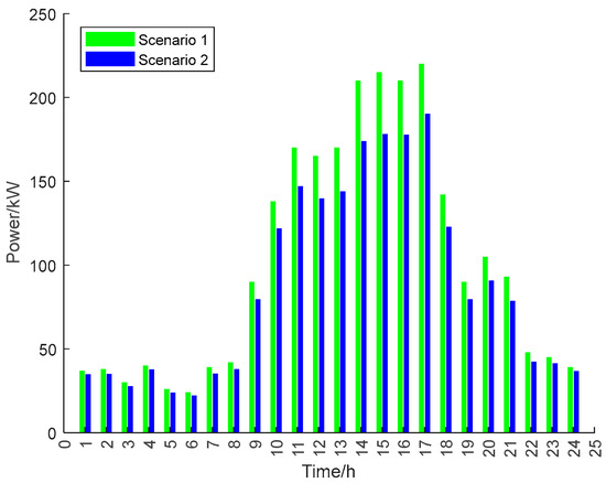 Unlike Scenario 1, Scenario 2 confines uncertainties to renewable energy output, omitting consumer behavioral volatility entirely. As a result, the operator’s operating cost, as shown in Table 1, is reduced. But the electricity consumption habits of some users will be subject to change due to the operator’s cluster scheduling, which improves the economy of electricity consumption of microgrid users to a certain degree, but at the same time, comfort impairment negatively impacts perceived utility, resulting in reduced comprehensive satisfaction among microgrid users. A comparison of the actual loads of Scenario 1 and Scenario 2 is shown in Figure 5.