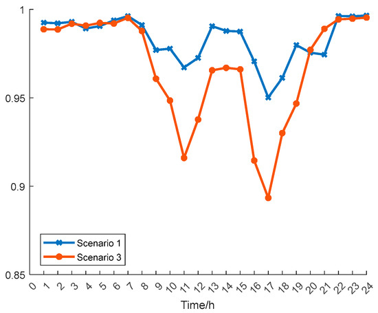 The comparison between Scenario 1 and Scenario 3 verifies that the method in this paper is more practical and instructive in terms of scheduling strategy compared to the method proposed in the literature [22]. From the optimization results, it can be seen that the method proposed in literature [22] will be oriented to time-of-day tariffs, and will be biased towards shifting part of the load from the peak of the tariffs and the nearby hours to the night and the morning, but this will lead to the user’s electricity consumption habits being drastically altered, so that the user’s satisfaction with the electricity consumption will be reduced. As shown in the data in Table 1, although the optimization method in the literature [22] has a lower operating cost than that of the method proposed in this paper, this type of optimization method will lead to a decrease in the customer’s satisfaction with electricity consumption due to scheduling, which in turn affects the customer’s willingness to participate in the scheduling of demand response in the future. A comparison of the results of Scenario 1 and Scenario 3 is shown in Figure 6.
