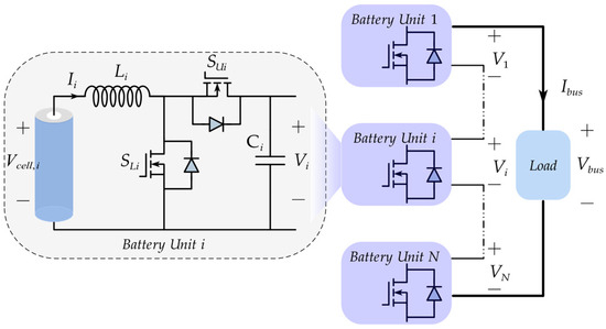 To enable cell-level energy balancing, each lithium-ion cell is connected to a dedicated bidirectional DC-DC converter, which facilitates both charge injection and extraction. In this work, as shown in Figure 1, a non-isolated Boost converter topology is adopted, which operates in Boost mode during discharging. In this structure, the battery cells are not physically connected in series, but their converter outputs are, emulating a series-connected battery pack.