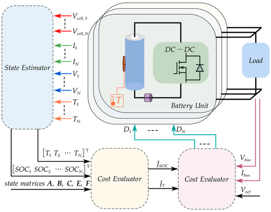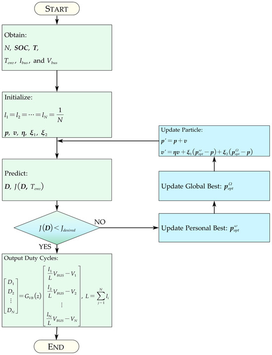 To realize coordinated electrothermal balancing while maintaining the overall bus voltage at a reference value, the generation of duty cycle commands for each cell-connected DC-DC converter follows the process in Figure 4.