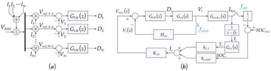 Small-signal control-oriented model: (a) outer loop for bus voltage regulation with N cells; (b) small-signal model of i-th cell.