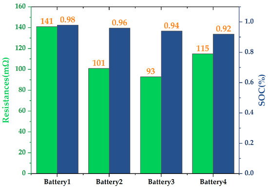This subsection describes the simulation setup used to validate the proposed electrothermal balancing control strategy. A custom simulation model was developed, incorporating the electrochemical and thermal dynamics of each cell, the bidirectional converter models, and the centralized controller with PSO-based weight optimization. The relevant battery parameters are summarized in Table 1, and internal resistance of the battery used for the simulation with the initial SOC value is shown in Figure 6. The initial SOC and internal resistance values were intentionally diversified to emulate real-world inconsistencies among cells, as also considered in previous works [19,20].