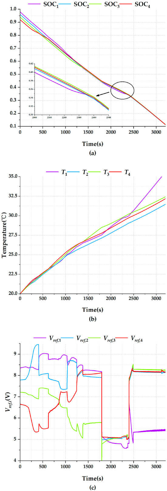 As illustrated in Figure 7c, the reference voltages assigned to each converter exhibit dynamic variations throughout the simulation, reflecting the combined influence of SOC imbalance, thermal deviation, and real-time bus voltage regulation. During the early and middle stages of the experiment (i.e., prior to 1800 s), heat generation within the cells remains limited. Under these conditions, the reference voltages are primarily governed by the initial SOC distribution. A clear positive correlation is observed between the assigned reference voltage and the corresponding cell’s SOC, with higher-SOC cells receiving larger voltage commands to facilitate faster discharge and promote charge equalization.