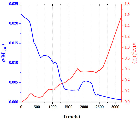 The simulation results demonstrate the capability of the proposed control strategy to achieve dynamic SOC equalization while maintaining thermal safety within acceptable limits. The standard deviation of both SOC and temperature error vectors ( and according to (15)) could be observed throughout Figure 8: the SOC deviation among cells gradually decreases over time under the influence of the PSO-based balancing controller. Starting from a deliberately imposed initial imbalance, the is effectively reduced through coordinated redistribution of discharge power. By the end of the simulation, the maximum SOC deviation is confined to approximately 0.0007, indicating near-complete charge uniformity.