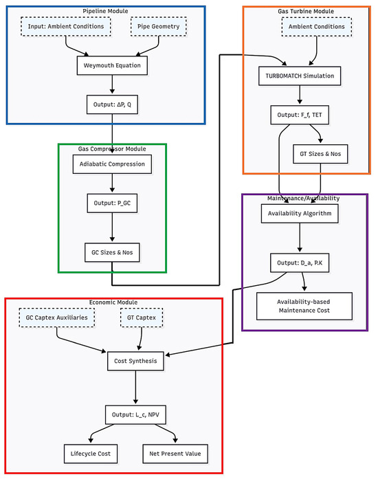 The TERA framework employed in this research constitutes an integrated computational architecture, designed to comprehensively evaluate the impact of compressor station availability on natural gas pipeline economics. As illustrated in Figure 1, this framework synthesises five interdependent yet interlocking analytical modules that systematically process physical, operational, and economic parameters. The novelty of this approach lies in its innovative integration of an availability quantification module within the TERA paradigm—a significant advancement for pipeline analysis. Outlined below are the details of each module’s structure, governing equations, interconnections with other modules and data exchange protocols.