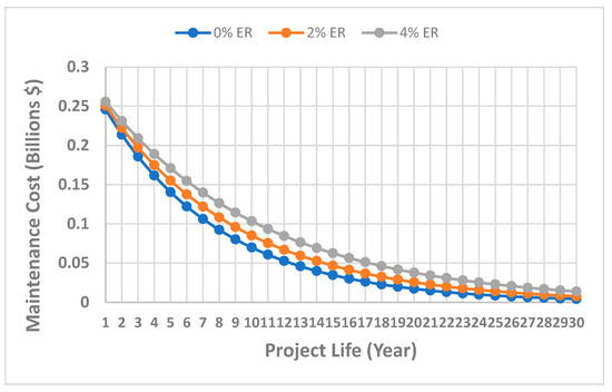 A maintenance factor 1 was assumed in the major maintenance cost evaluation. This is utilised by [22,23,52] to estimate the cost of maintenance of gas turbines. The major maintenance cost is a turbine entry temperature-based cost where the shaft power was constant during operation with variation in the engine TET and the fuel consumed.