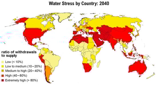 The global water crisis affects around 3 billion people [1]. This phenomenon is the result of a combination of anthropogenic and environmental factors. Rapid population growth, combined with increasing urbanization, significantly increases the water demand, particularly for agricultural needs [2,3,4]. In addition, aging and inefficient infrastructure are causing significant losses during water delivery [5]. Climate change is worsening the situation, with prolonged droughts and erratic rainfall reducing renewable freshwater resources. The outlook for 2040 is worrying: global water demand could increase by 20–30% due to pressure from population growth and industrialization [5,6,7,8,9], as shown in Figure 1. In many regions, freshwater resources may no longer be sufficient to meet basic needs. In addition, the intensification of extreme climate events could widen the disparities between areas with abundant resources and those already affected by severe water stress [10]. These projections highlight the urgent need for sustainable, innovative solutions to preserve water resources.