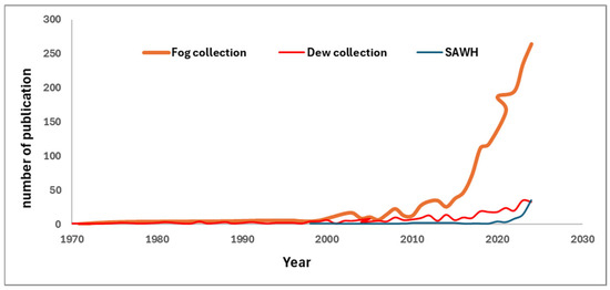 The fog harvesting technique uses large nets to capture tiny droplets of water already present in the air in liquid form. The collection of dew water cools the air below its dew point, causing water vapor to condense into a liquid. Lastly, sorption atmospheric water harvesting (SAWH) is a more advanced process that separates the water vapor from the air, enabling various sorbents to operate even when the ambient dew point is below zero. After sorption, the adsorbent is heated, releasing the water vapor into a closed chamber where high local humidity conditions are created, allowing the vapor to condense. Figure 3 shows the number of papers published on the subjects in the last 30 years. It is possible to notice that there is a constant increase in the number of papers on the topic, indicating an increased interest in the issue. Among the various processes, fog collection has received the highest attention, but the number of papers on SAWH has steeply increased in the last 5 years, being now close to the works on dew collection.