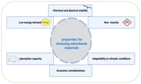 In an atmospheric water harvesting system by adsorption, the selection of the adsorbent material is a key factor in determining performance [45]. Various types of sorbents are commonly used for this purpose, including conventional nanoporous solids, advanced polymers, MOFs, hydrogels, salt-based composites, and liquid sorbents [46]. A summary of their respective properties is provided in Table 1. The choice of an appropriate adsorbent is guided by several critical factors (see Figure 6). First, the material must exhibit a high water uptake capacity to effectively capture and retain moisture from ambient air. Second, the adsorption and desorption kinetics play a crucial role, as faster cycles enhance overall system efficiency. The chemical and structural stability of the material is also essential to ensure long-term durability without significant degradation. Additionally, the adsorbent must be non-toxic and safe for use in contact with potable water. Another key consideration is its ability to function efficiently under varying climatic conditions, adapting to fluctuations in temperature and humidity. Finally, economic factors, including production costs and material availability, influence large-scale feasibility and widespread adoption.