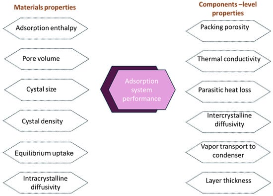 Material and component-level properties influencing the performance of adsorption-based atmospheric water harvesting systems.