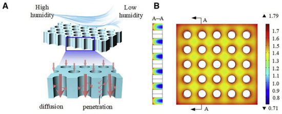 Recent studies have also successfully demonstrated the rapid transport of water molecules in nanoconfined channels, leading to a rapid kinetic process. Zhu et al. obtained porous carbon materials with nanochannels with a moderate pore size (0.85 nm) and an appropriate hydrophilic groups density (40%) for rapid water transport [36]. Based on theoretical simulation, it was shown that 40% of the hydrophilic sites density has the lowest water diffusion barrier. In addition, ~1.1 nm pore size also has low barrier to water diffusion, ensuring appropriate RH for the application. Consequently, the customized porous carbon exhibited fast kinetics (adsorption rate constant is 0.071 min−1).