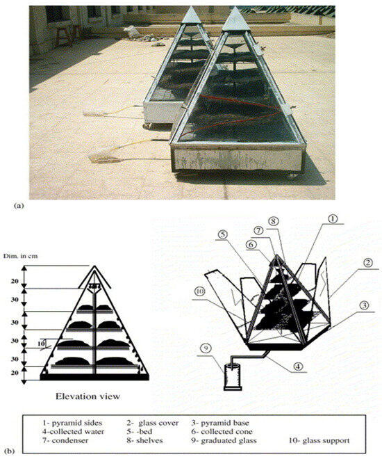 - Kabeel, A.E. Water Production from Air Using Multi-Shelves Solar Glass Pyramid System. Renew. Energy 2007, 32, 157–172. [Google Scholar] [CrossRef]