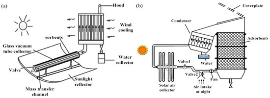 - Wang, J.Y.; Liu, J.Y.; Wang, R.Z.; Wang, L.W. Experimental Investigation on Two Solar-Driven Sorption Based Devices to Extract Fresh Water from Atmosphere. Appl. Therm. Eng. 2017, 127, 1608–1616. [Google Scholar] [CrossRef]