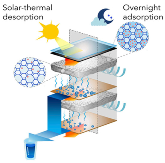 - Kim, H.; Rao, S.R.; Kapustin, E.A.; Zhao, L.; Yang, S.; Yaghi, O.M.; Wang, E.N. Adsorption-Based Atmospheric Water Harvesting Device for Arid Climates. Nat. Commun. 2018, 9, 1191. [Google Scholar] [CrossRef]