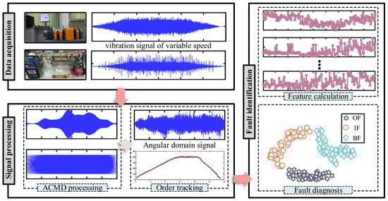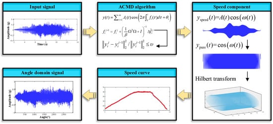 As follows in the flowchart in Figure 3, the raw vibration signal, which is inherently non-stationary due to the varying rotational speed, is first subjected to ACMD. This algorithm is particularly well-suited for analyzing non-stationary signals, as it adaptively extracts intrinsic mode functions that reflect the underlying time-varying frequency components. This study employs the ACMD algorithm to isolate the dominant component associated with the shaft’s rotational speed. This extracted speed profile is then utilized to perform order tracking, transforming the time domain signal into the angular domain, thereby eliminating the influence of speed fluctuations and enabling a more consistent analysis of fault characteristics.