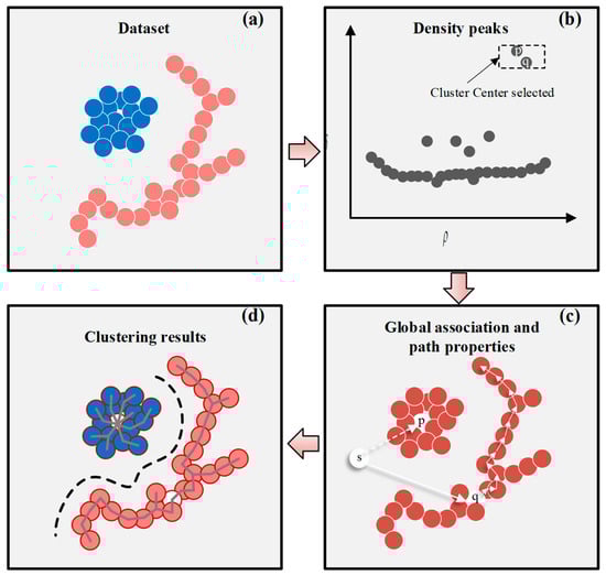 The core idea of the SP-DPS algorithm (a) Raw data set; (b) Density peak; (c) Path search; (d) Clustering.