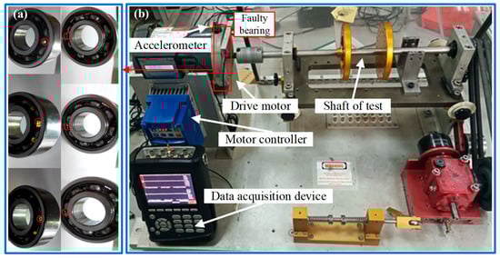 The test bench used in Experiment 1 with the faulty bearing. (a) Fault bearing; (b) Experimental platform.