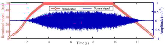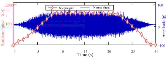 The control strategy for the variable speed condition is implemented as follows: the variable speed condition is linearly accelerated from the static state to the rated speed of 3000 rpm, and a constant speed is maintained for 5 s before undergoing linear deceleration to complete rest. Its normal signal sample and variable speed curve are shown in Figure 5.