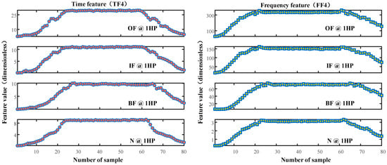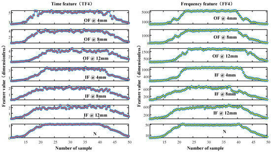 In this experiment, each angular domain signal segment used for feature calculation contains 2048 points, resulting in 80 samples for each fault category and a total of 320 samples. Furthermore, in order to show the changes of time domain features and frequency domain features in the process of variable speed, TF4 of time domain features and FF4 of frequency domain features are extracted and plotted in Figure 15. From Figure 15, it can be observed that the time domain features and frequency domain features will change with the change of speed. This is similar to Experiment 1.