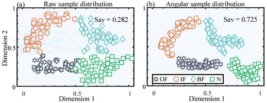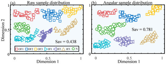 Furthermore, to evaluate the quality of feature separability, the Silhouette Average Value (Sav) [39] is used as a quantitative indicator. A higher Sav indicates better feature distribution for clustering. The comparison between Figure 9a (raw signal) and Figure 9b (angular domain signal) shows that the proposed method significantly improves Sav, validating its superiority in feature extraction and transformation.