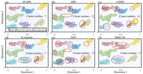 The methods used for comparison include DAP clustering [36], ATDPS clustering [29], K-medoids clustering [40], and DBSCAN clustering [41]. The clustering results obtained by all methods are shown in Figure 10. For a further comparison, the quantified statistics are shown in Table 6.