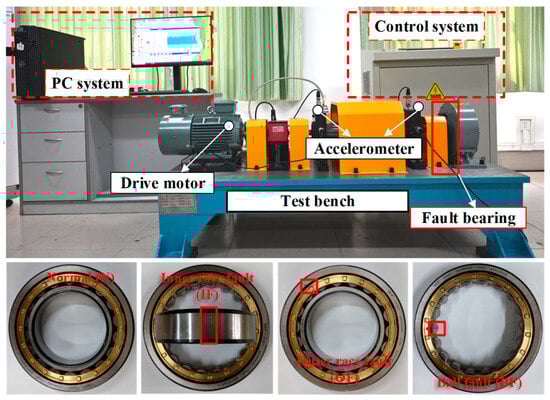 To validate the proposed method’s effectiveness in improving the operational reliability and energy efficiency of critical rotating equipment, this study employs a widely used and publicly available bearing fault dataset [38], which has become a benchmark in condition monitoring and intelligent fault diagnosis research. The test bench used in Experiment 1 with the faulty bearing is displayed in Figure 4.