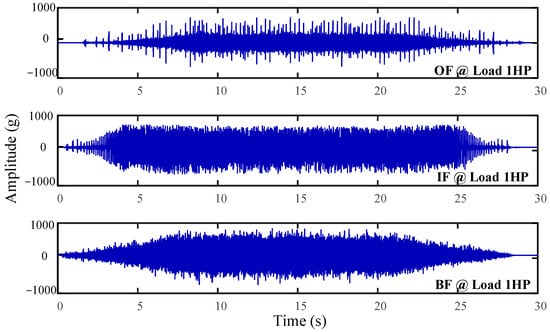 The test bearing, a cylindrical roller bearing (SKF-NU216), is mounted on the right side of the platform, representing a typical load-bearing position in traction motors. During the experiment, analog vibration signals are collected and converted into digital form using a high-fidelity data acquisition device and then transmitted to a PC-based monitoring system for real-time processing. Three piezoelectric accelerometers are strategically positioned on the bearing housing—covering horizontal, vertical, and axial (parallel) directions—to capture multidimensional vibration characteristics that reflect complex fault dynamics under variable speed operation. Each channel is sampled at 20 kHz to capture high-frequency fault components accurately. The experimental procedure includes a complete variable speed profile: initial acceleration, steady-state running, and final deceleration to a complete stop. This dynamic operation replicates the actual load cycles experienced by traction motors in metro systems, making it ideal for validating diagnostic algorithms aimed at energy-critical applications.