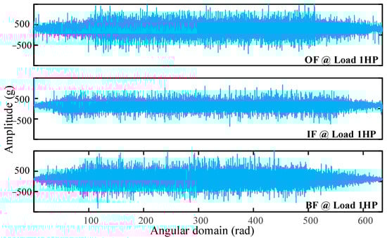 Angular domain signals obtained from three different bearing fault vibration signals.