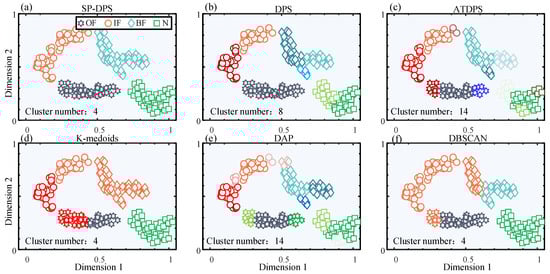 Fault diagnosis results obtained by six clustering methods (a) SP-DPS; (b) DPS; (c) ATDPS; (d) K-medoids; (e) DAP; (f) DBSACN.