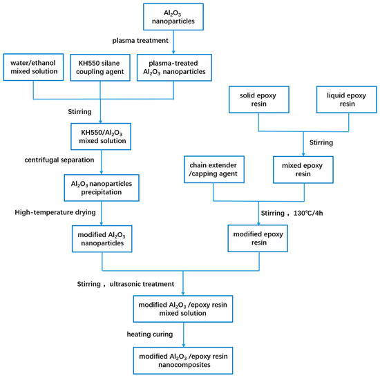 To prepare the modified Al2O3/epoxy resin nanocomposites, modified Al2O3 nanoparticles were incorporated into the regulated epoxy resin solution with mass ratios of 10%, 20% and 30%. The mixture was subjected to mechanical blending at 130 °C for 2 h, following by the addition of curing agent equivalent to 38% of the total resin mass and continuous stirring for 15 min. The mixture was then vacuum degassed in a vacuum oven at 130 °C for 10 min. Subsequently, the degassed mixture was injected into preheated molds for secondary vacuum degassing. Finally, the molds were placed in a vacuum oven under a curing condition of 130 °C and 40 h to obtain the ultimate Al2O3/epoxy resin nanocomposites. The fabrication processes of materials are illustrated in Figure 1.