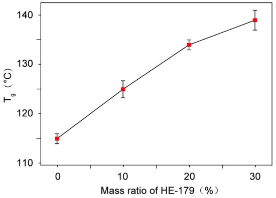 The bisphenol A-type epoxy resin has a relatively lower crosslinking density, indicating fewer crosslinking nodes within epoxy resin networks and longer molecular chains. This structural configuration facilitates the rotational and translational mobility of polymer chain segments upon heating, thereby enabling the initiation of cooperative segmental motion at relatively lower temperatures and a relatively lower Tg. The appropriate incorporation of cycloaliphatic epoxy resin with a higher crosslinking density will provide more crosslinking nodes and shorten the average length of molecular chains in the epoxy resin composite, thus restricting the rotational and translational mobility of polymer chain segments and resulting in a higher Tg of epoxy resin composite which facilitates the structural stability and the mechanical and electrical properties at higher temperatures. Therefore, crosslinking modification was performed by introducing cycloaliphatic epoxy resin HE-179 into the BPA-EP matrix with a molecular structure, as shown in Figure 2. The Tg of materials with different mass ratios were measured and the results are shown in Figure 3. The Tg of the modified epoxy resin increased progressively with increasing the mass ratio of HE-179 resin. When the mass ratio of HE-179 reached 20%, Tg of the polymer reached 134 °C. The high Tg can prevent the polymer from transforming into a highly elastic state and improve the performances of insulating devices. For prevention of the further increase in fabrication cost and brittleness of materials, the following studies were conducted using 20% HE-179 containing dual-crosslinked epoxy resins.