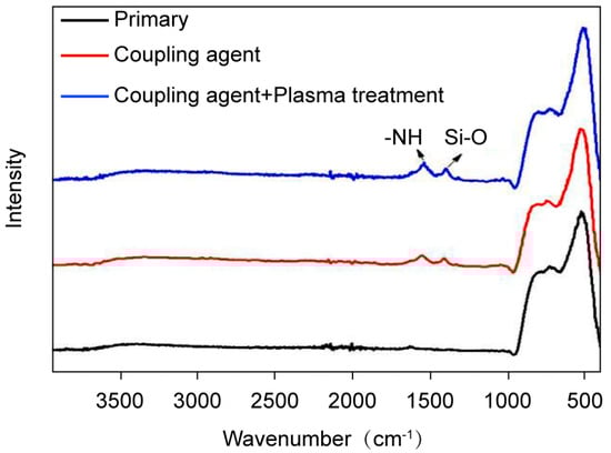 The size distribution of agglomerating Al2O3 particles in organic media was determined using a laser diffraction particle size analyzer to verify particle dispersion quality. As shown in Figure 7, the unmodified Al2O3 nanoparticles exhibited the widest particle size distribution. KH550-modified Al2O3 nanoparticles showed a narrower distribution, while Al2O3 nanoparticles with plasma treatment and silane coupling agent grafting displayed the narrowest particle size distribution. Notably, the combined modification approach resulted in significantly improved dispersion of Al2O3 nanoparticles in organic matrices.