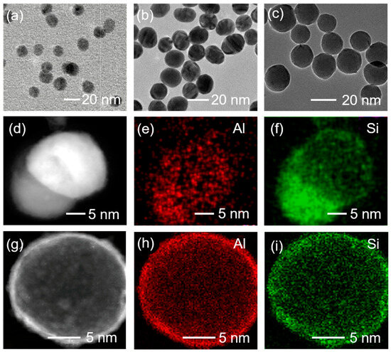 TEM images of (a) primary Al2O3 nanoparticles, (b) modified Al2O3 nanoparticles without plasma treatment and (c) modified Al2O3 nanoparticles with plasma treatment. (d–f) TEM image of a modified Al2O3 nanoparticle without plasma treatment and EDS mapping images of Al and Si. (g–i) TEM images of a modified Al2O3 nanoparticle with plasma treatment and its EDS mapping images of Al and Si.