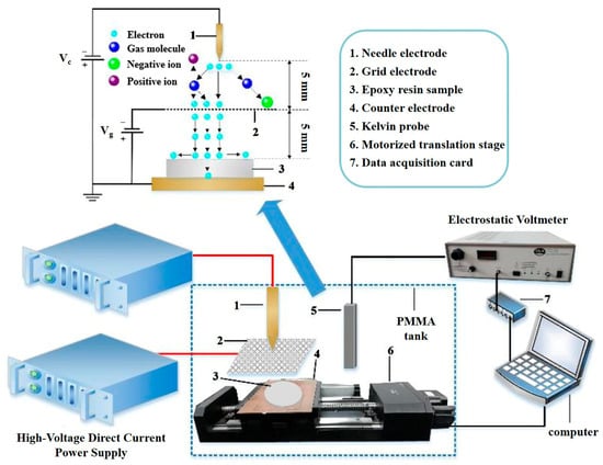 The glass transition temperatures (Tg) of the epoxy resin materials were tested by using a differential scanning calorimeter (DSC8500, PerkinElmer, Waltham, MA, USA) according to Recommended National Standard of the People’s Republic of China (GB/T 40396-2021) [39]. The combination of nanofillers with the epoxy resins under different surface treatment conditions was investigated by Fourier transform infrared spectrometer (FTIR) (Nicolet iS50, Thermo Fisher, Waltham, MA, USA) complying with GB/T 6040-2019 [40]. The tensile and bending strengths of different epoxy resin materials were tested using a mechanical universal testing machine (CMT4204, MTS, Eden Prairie, MN, USA) on the basis of GB/T 1040.1-2018 [41] and GB/T 9341-2008 [42], respectively. The impact strengths of different epoxy resin materials were tested by a film impact tester (EZ83, Vice, Hangzhou, China) according to GB/T 1843-2008 [43]. The breakdown strengths of samples were investigated by a voltmeter (RK7110, Rek, Shenzhen, China) according to GB/T 11408.1-2016 [44]. The laser particle size analyzer (Bettersize2600, Dongjiang Bettersize, Dandong, China) was used to investigate the dispersion of nanoparticles in the matrix according to GB/T 41949-2022 [45]. Corona charging experiments were conducted through a surface potential measurement system including an electrostatic voltmeter (Trek 341B, Trek, Cambridge, MA, USA). The surface and volume resistivity were tested by using a resistivity tester (SCX7680/SCX7660, JUNDA, Guangzhou, China) in accordance with GB/T 31838.3-2019 [46]. A transmission electron microscope (TEM) (JEM F200, JEOL, Tokyo, Japan) equipped with an energy-dispersive spectroscopy (EDS) and scanning electron microscope (SEM) (Verios G4 UC, Thermo Scientific, Waltham, MA, USA) were used to investigate the morphology and element distribution of materials and samples.