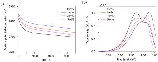 The interface interaction zone between nanofillers and the polymer matrix is a critical region influencing charge transport in materials. Corona-charging experiments presented in Figure 10 were conducted through a surface potential measurement system including an electrostatic voltmeter to investigate the charge transport mechanism. The results are shown in Figure 11a. By analyzing the surface potential decay kinetics, the relative relationship between trap level and trap density was investigated (Figure 11b) [50]. The static shielding layer surrounding nanoparticles creates a high potential barrier, while surface functional groups can trap charge carriers to achieve the electrostatic equilibrium, thereby inhibiting surface charge migration. By continuously adding Al2O3 nanoparticles, the trap level and trap density first increase and then decrease. At an Al2O3 mass fraction of 3%, trap level and trap density reach their maximum values, indicating the enhanced capability of charge restriction in the interfacial region. The subsequent decline of trap level can result from the excessive Al2O3 introduction and insufficient interfacial bonding between fillers and polymer matrix at higher filler loadings, leading to more defects which weaken the effect of charge capture [51,52].