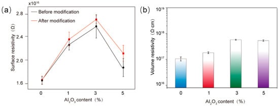 The influence of different Al2O3 contents on the surface resistivity (a) and volume resistivity (b) of epoxy resin composites.