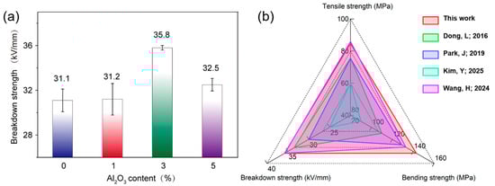 (a) The influence of Al2O3 content on the breakdown strength of epoxy resin composites and (b) performances comparison of the modified Al2O3/epoxy nanocomposite and other epoxy resin-based materials reported in the literature [53,54,55,56].