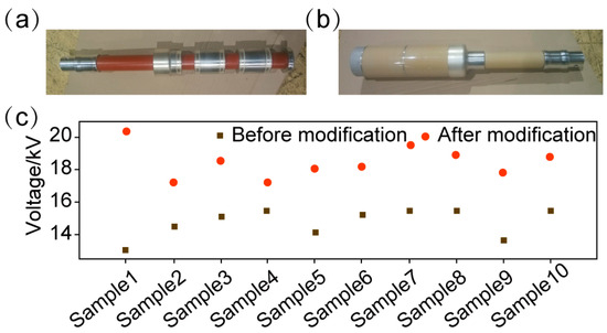 Based on the modified Al2O3/epoxy composites, we fabricated insulating pull rods for high-voltage electrical equipment. The inner and outer sleeves are shown in Figure 14a,b. Figure 14c summarizes the flashover voltages of samples before and after modified Al2O3 doping modification. The average flashover voltage of the unmodified material was 14.7 kV, while that of the modified material increased to 18.5 kV, representing 26% enhancement, which demonstrates the significant application advantages of the modified Al2O3/epoxy composite.