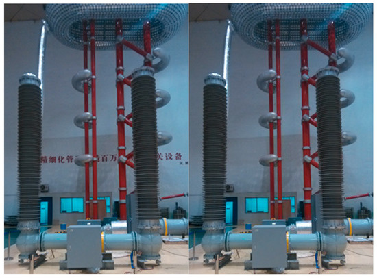 We further applied this composite to a prototype of high-voltage (200 kV) direct current floor tank-type high-speed mechanical switch (Figure 15). The modified Al2O3/epoxy composite-based insulating pull rod successfully met the requirements for both insulation and mechanical performances in the direct current high-speed switch. During the dynamic insulation test, no breakdowns occurred after 15 repeated operations under applied voltage of ±300 kV. In the static insulation test, the direct current withstand voltage reached 230 kV, with rated lightning impulse withstand voltages of 410/640 kV (breaker gap/to ground) and rated switching impulse withstand voltages of 320/320 kV (breaker gap/to ground). After 2000 cycles, the opening stroke was 30.8 mm, with an opening time of 2.1 ms and opening speed of 9.8 m/s, while the closing stroke was 31.35 mm, with a closing time of 7.5 ms and closing speed of 4.18 m/s, which all meet the performance requirement for high-speed mechanical switches. These results successfully validate the engineering effectiveness of our key technologies and provide theoretical foundations and technical supports for developing 200~500 kV high-voltage direct current high-speed mechanical switches.