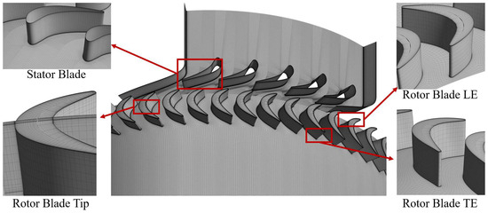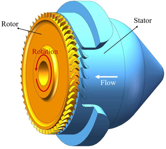 This paper investigates a S-CO2 axial turbine, with the thermodynamic and geometric parameters listed in Table 1. The mass flow rate in the table represents the full admission conditions, and the performance and flow field of the turbine under partial admission conditions will be analyzed later. The turbine has relatively small geometric dimensions, with both the chord length and blade span on the millimeter scale. The choice of an axial design is based on the fact that a radial design would result in higher turbine rotational speeds, which are more difficult to achieve. A 3D schematic of the turbine is shown in Figure 1, where the blue section represents the stator and the orange section represents the rotor. In this schematic, six passages are retained, corresponding to the areas between five adjacent stator blades, while the other passages are blocked. The active sector considered in this study is continuous in the circumferential direction, and the discontinuous distribution of active sector is not considered. The sidewall shapes of the active sector are consistent with the suction and pressure surfaces of the corresponding blades in order to minimize the interference of wall shape on the flow field analysis. The partial admission ratio (PAR) is defined as the active fraction of the stator exit area. The turbine efficiency is calculated using Equation (1), which is employed consistently throughout this paper: